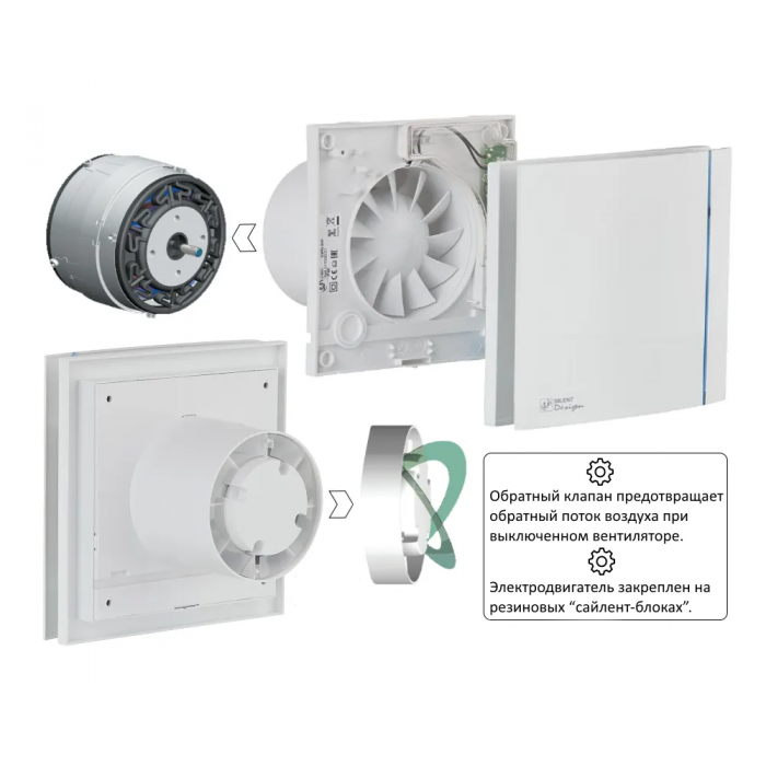 - Вентилятор Soler & Palau SILENT-100 CZ Champagne Desing Swarovski - оснащен обратным клапаном, который предотвращает обратный поток воздуха в помещение.